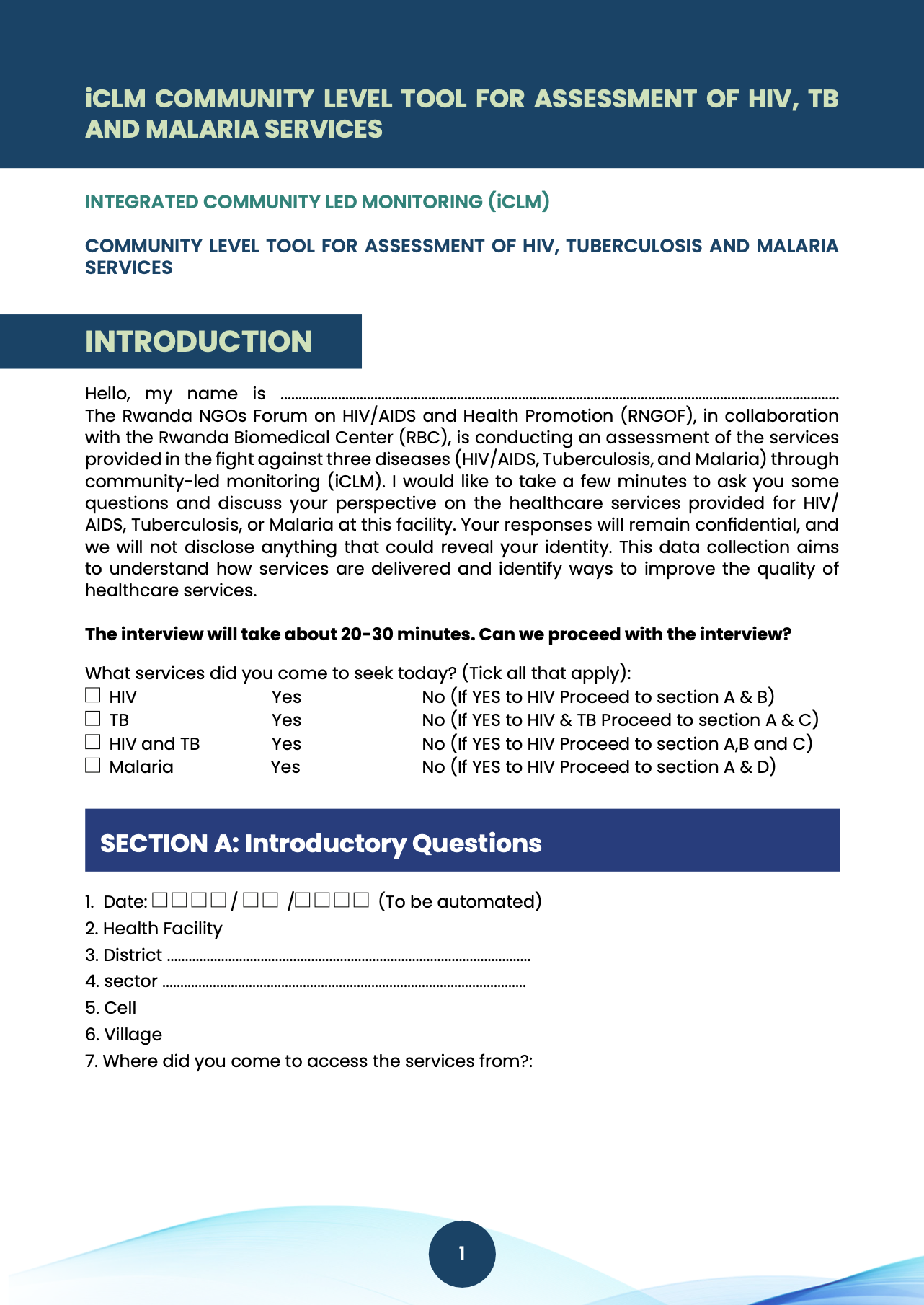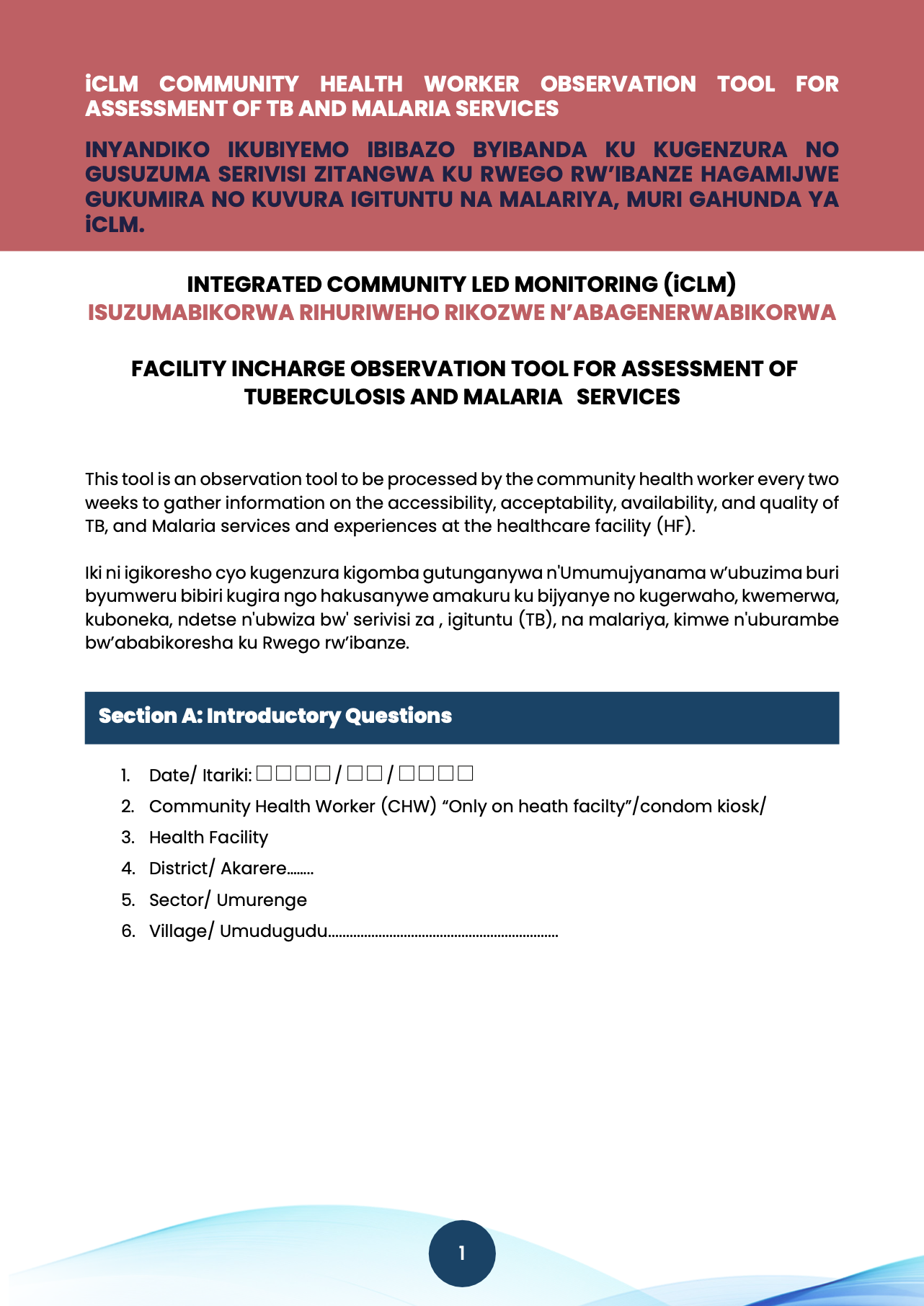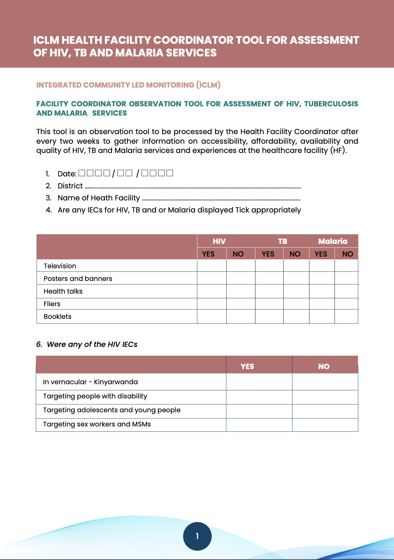 Collects biweekly information on the accessibility, acceptability, availability, and quality of TB and Malaria services at healthcare facilities by community health workers.